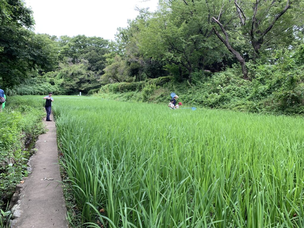 駒場野公園内ケルネル田んぼで水質調査と水辺のいきもの調査を行いました。案内してくださった自然観察舎の方はとても昆虫に詳しくて、トンボのオスメスの見分け方や、セミの抜け殻の特徴で種類がわかることなど、子どもたちや大人にもとてもわかりやすく説明してくださいました。